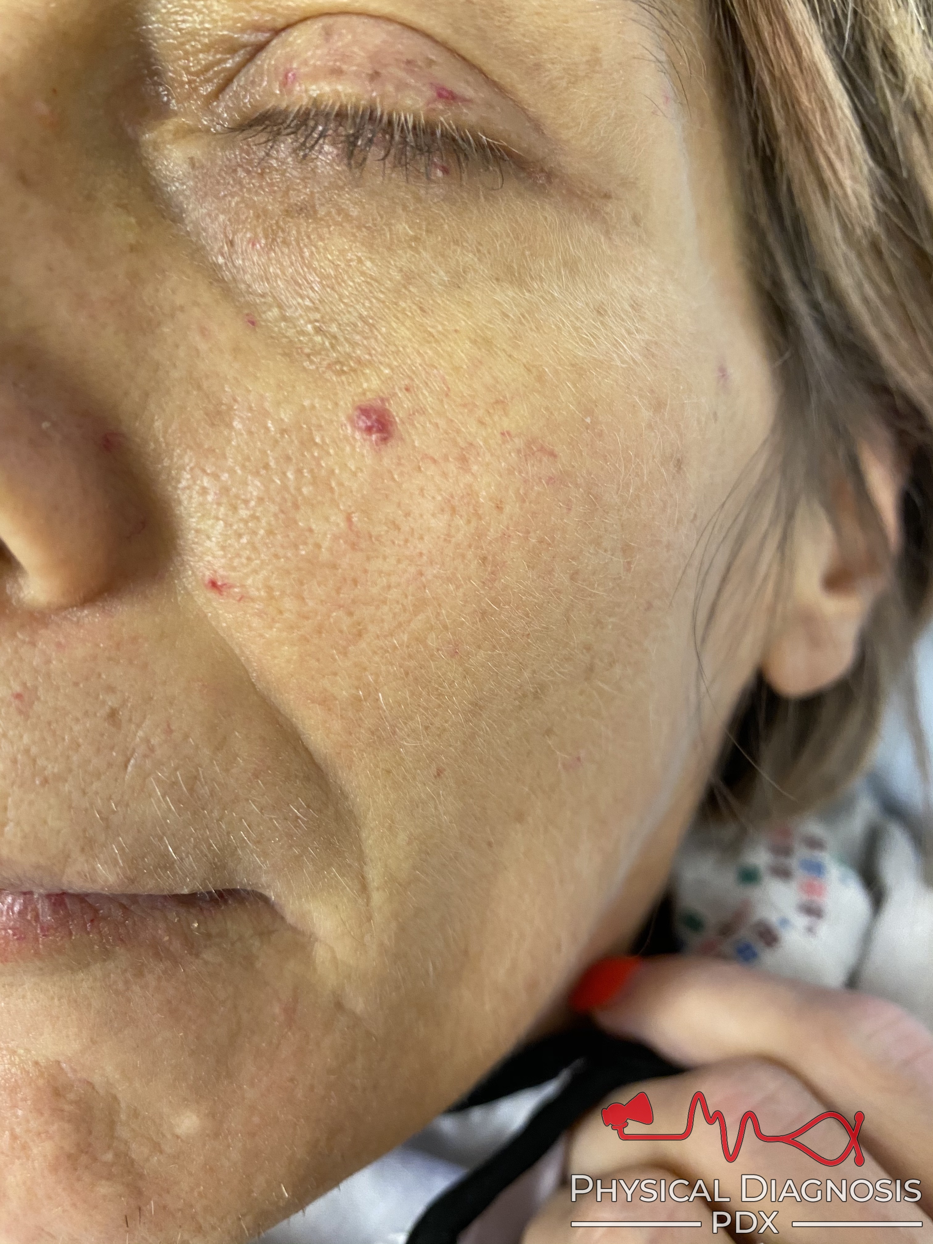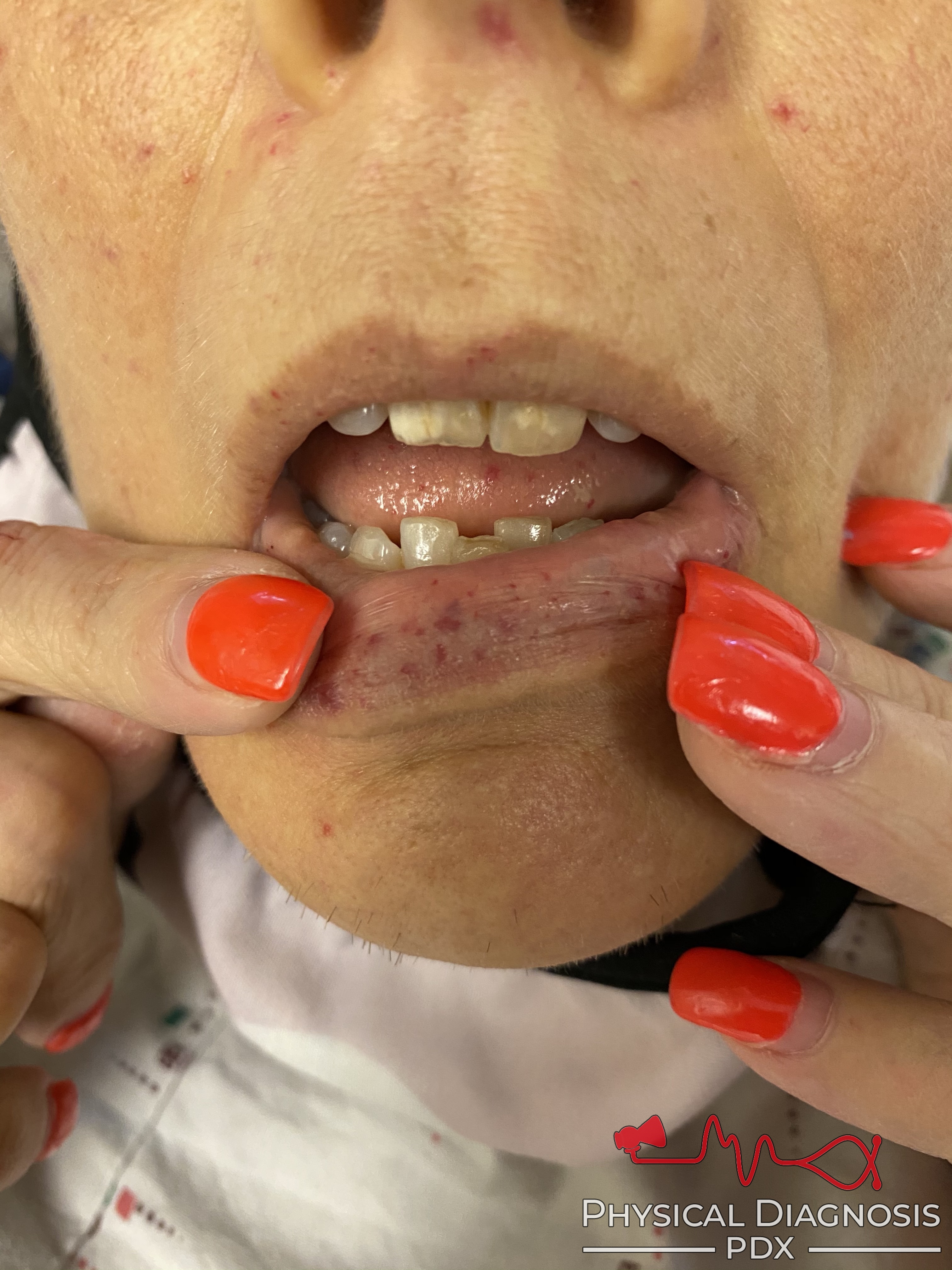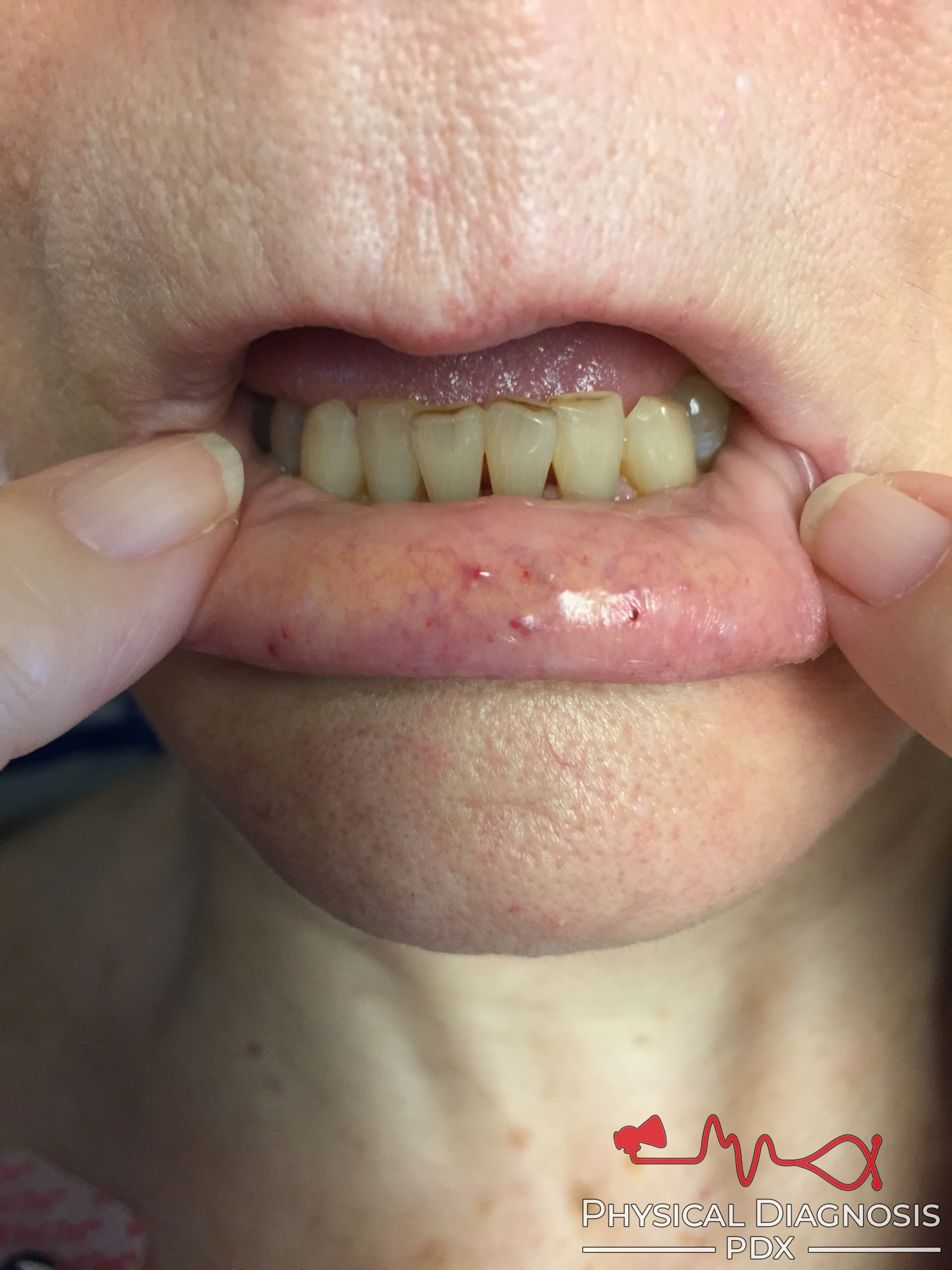 This is a middle-aged woman with hereditary hemorrhagic telangiectasia who was admitted to the hospital for an unrelated reason.