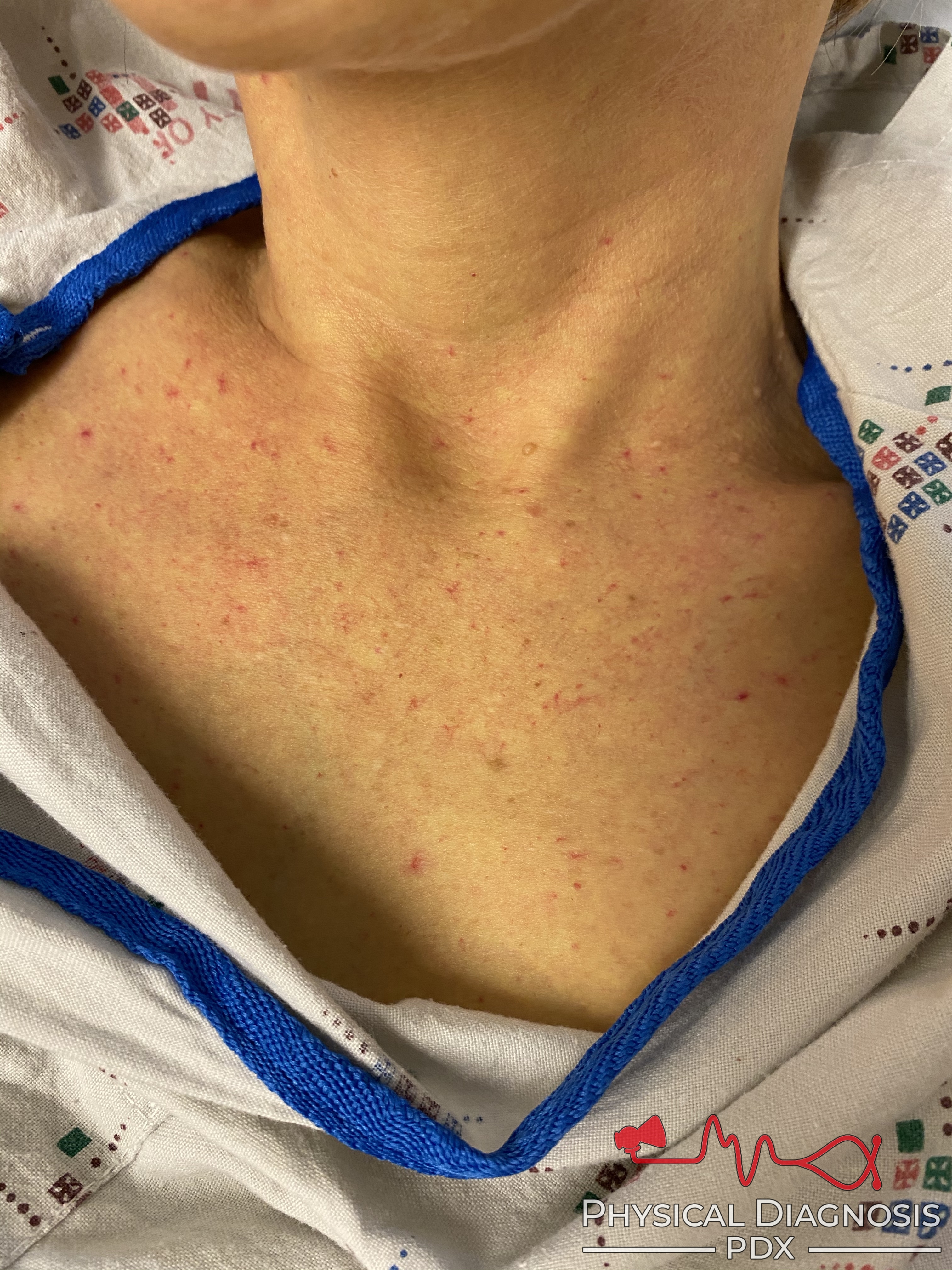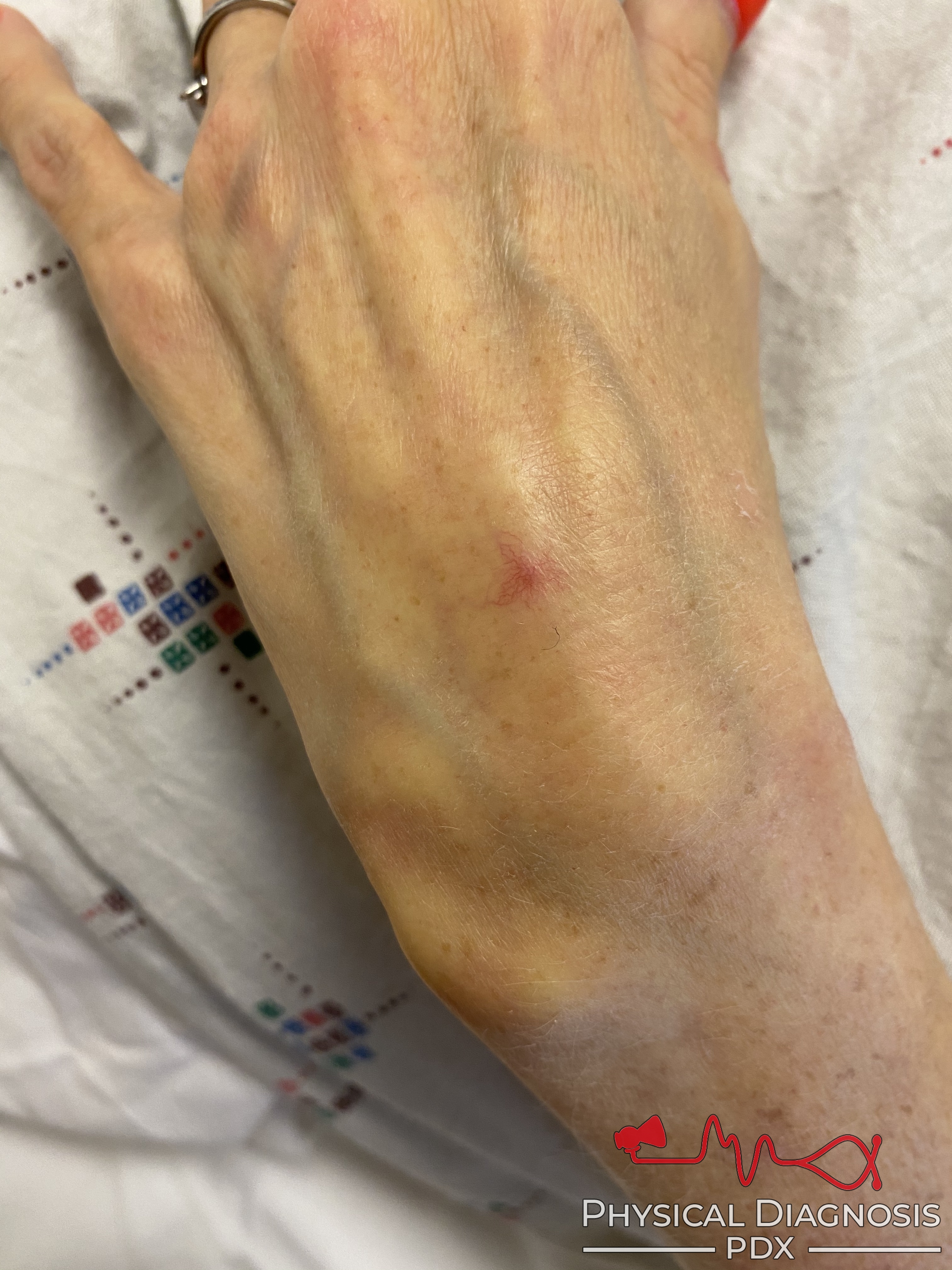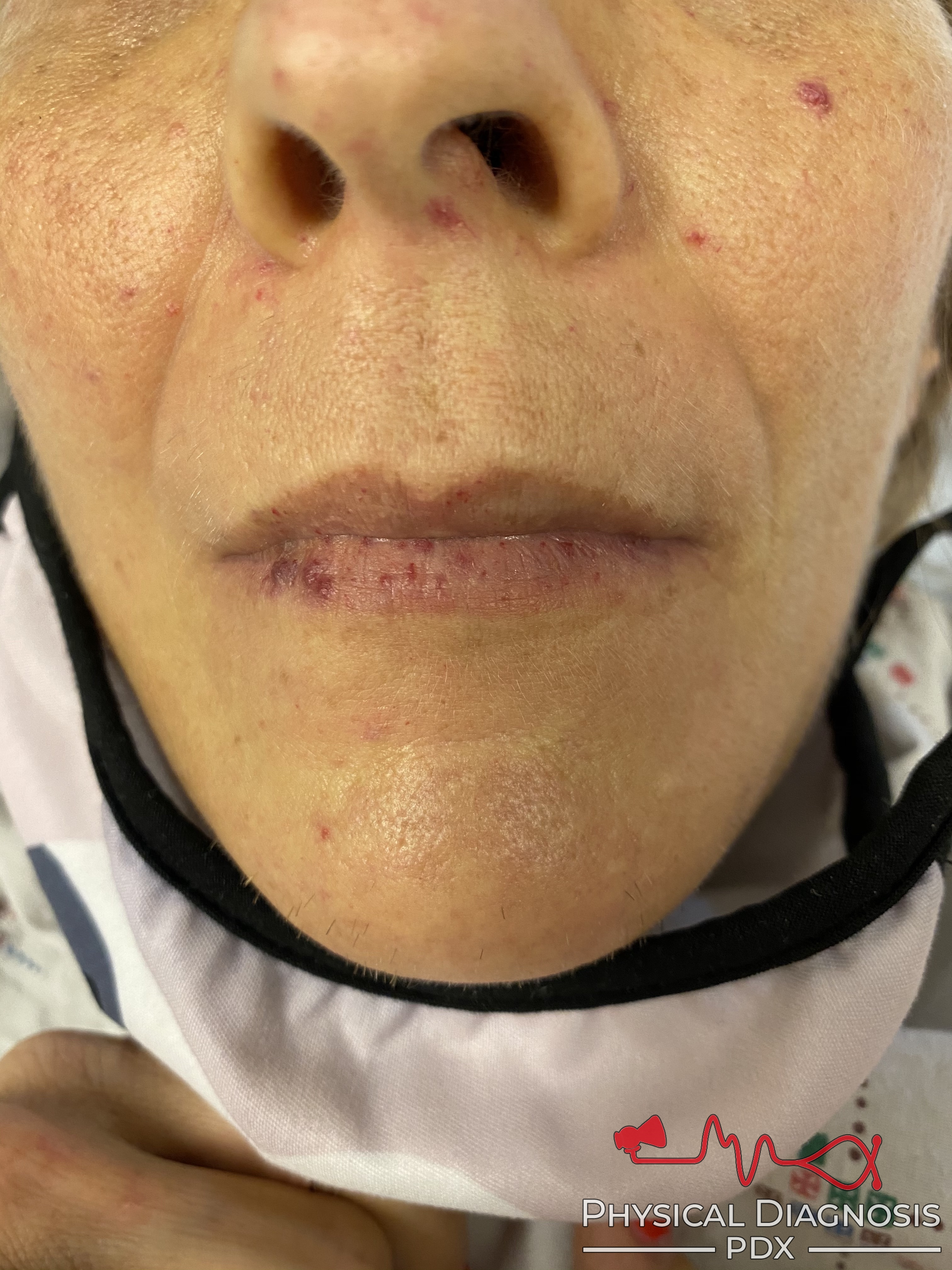 This is a middle-aged woman with hereditary hemorrhagic telangiectasia who was admitted to the hospital for an unrelated reason.