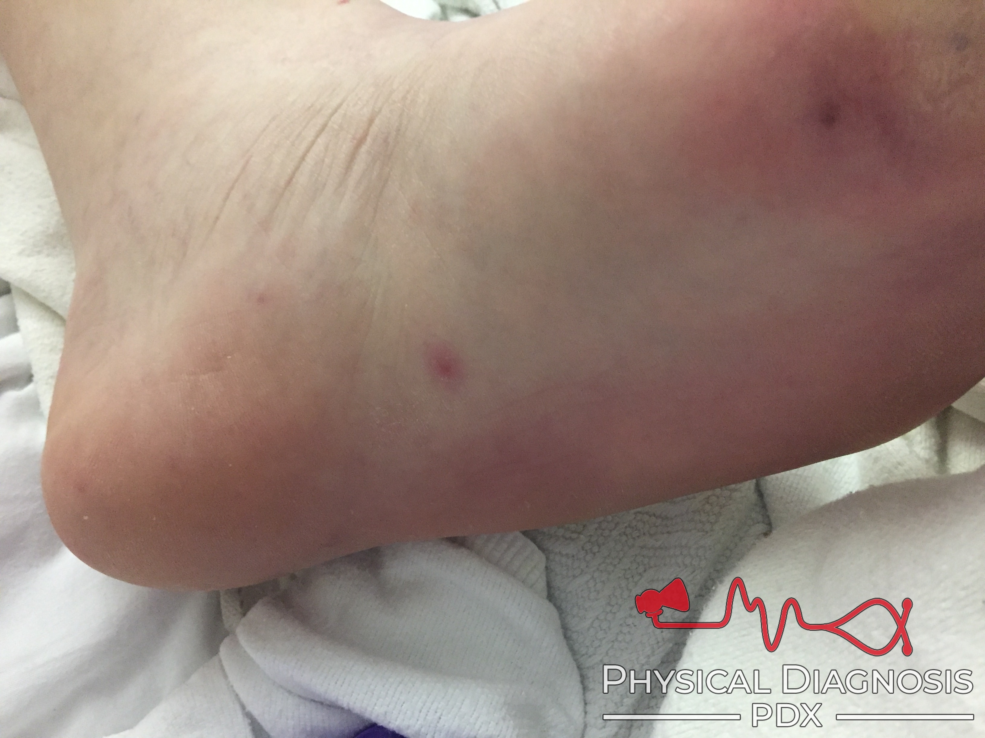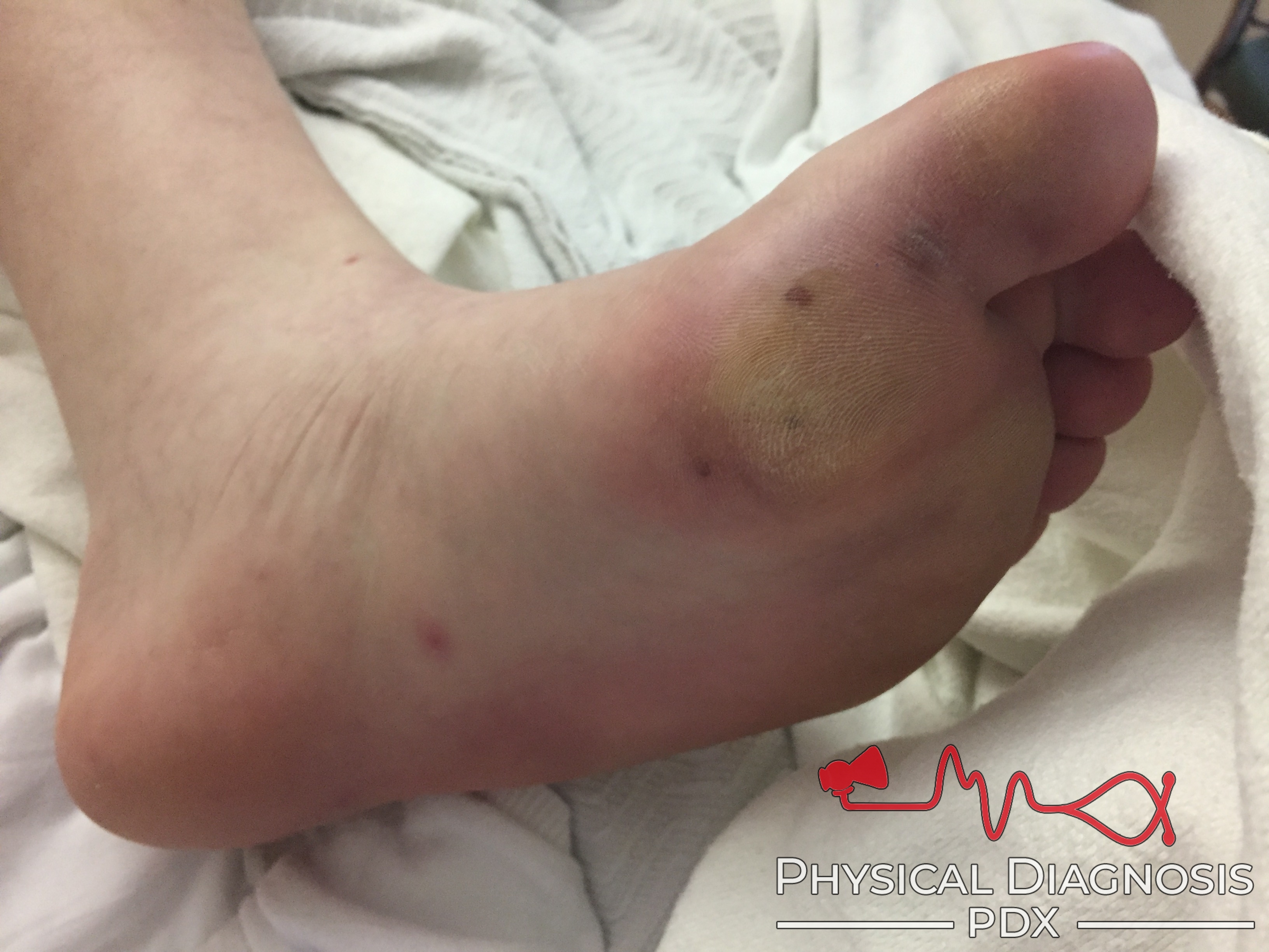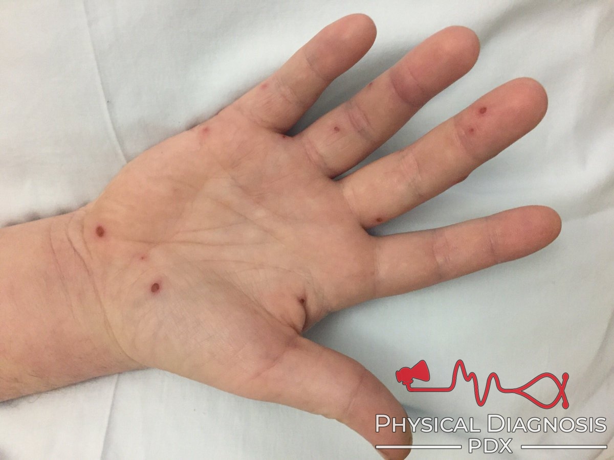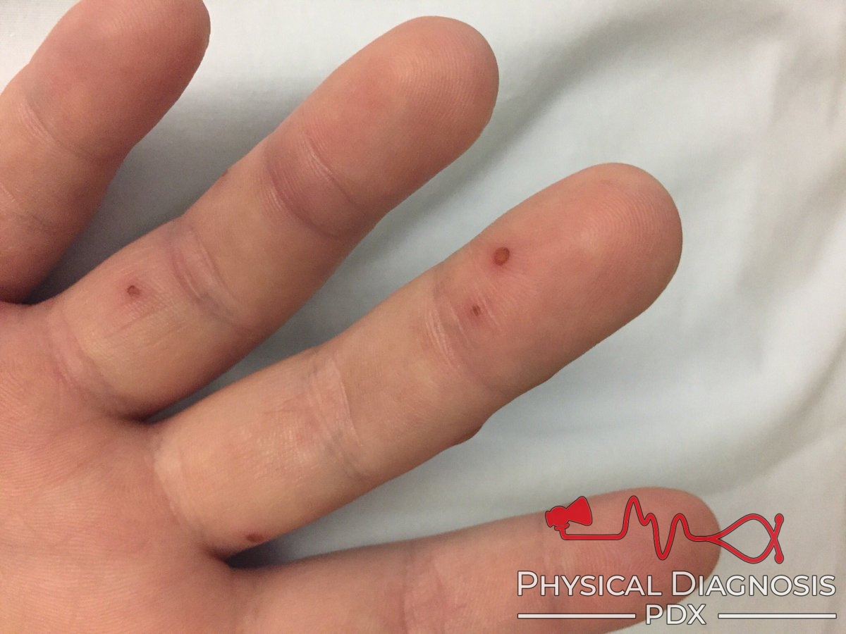 Tender erythematous or violaceous subcutaneous nodules on the thenar and hypothenar eminences and pulps of fingers and toes.