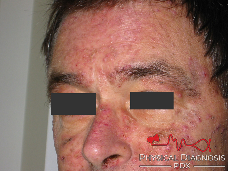 This patient has iododerma from getting so many iodinated CT scans in such a short time. He also has neutrophilic dermatosis and livedo reticularis.